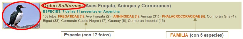 Si estás en una página de especie, un enlace azul te llevará al grupo de cabecera, que puede ser un orden, suborden, familia o subfamilia.
