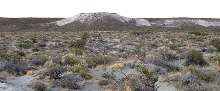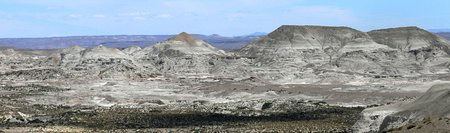 | Paisaje de las barrancas blancas. Nótese la poca vegetación. | View of the white hillsides. Note the scant vegetation in the foreground. |