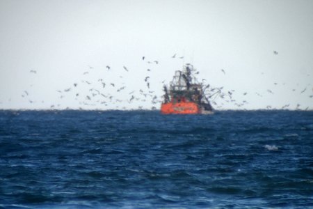 birds Swarming around a fishing vessel. Taken by digiscoping at over 3 km |