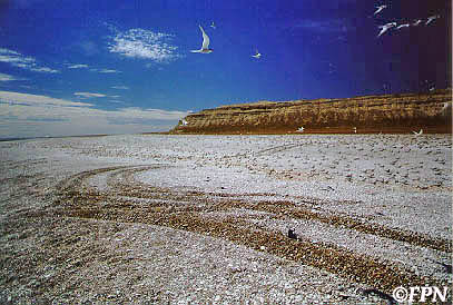 Huellas de una 4x4 atraviesan una colonia de nidificación de gaviotines.