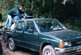 Domingo 22 de Julio de 2000 a las 8:00 Antes que amaneciera, dejamos la ruta principal para internamos unos pocos kilómetros hacia el oeste por un camino de tierra, para llegar hasta la entrada del Parque Nacional. Mirando por las ventanillas delanteras veía como la densa vegetación que bordeaba el camino demarcaba un estrecho túnel. Nos abríamos paso lentamente por este caño de vegetales, iluminado por los fuertes faros. El parque estaba cerca, y presentía como la misteriosa selva devoraba a nuestro vehículo. Esperaba en cualquier momento la sorpresiva aparición del Jaguar que había imaginado. Pero desconocía que a ambos lados de este camino demarcado por arboles ya no quedaba selva: solamente había estériles plantaciones de caña de azúcar. El avance fue muy lento, para no causar daños al gran ómnibus, pero finalmente llegamos al destino. Pudimos leer, incrédulos, el ansiado cartel: "Bienvenidos al Parque Nacional Calilegua". Nada hubiera superado nuestro asombro y emoción – a no ser "Bienvenidos al Parque Jurásico". Pronto cambiaría radicalmente la actividad del grupo. Moviendonos como osos que salen perezosamente de su letargo invernal, nos pusimos calzado y abrigo, buscamos las mochilas dispersas en asientos vecinos y guardamos los enseres utilizados durante el viaje. Mentalmente nos preparamos para comenzar la vida de campamento.