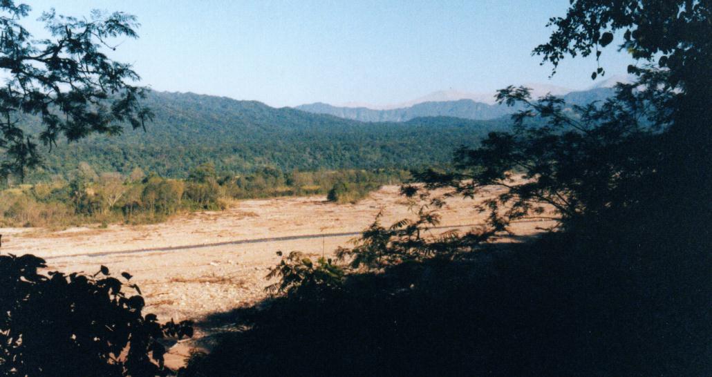 se decidían por un lugar adecuado para la carpa. Aproximadamente en el centro del predio estaba el fogón y tres mesas de madera con banquetas. Cerca de allí se instaló la gran "Carpa Cocina". Todo este sector pronto pasaría a ser nuestro lugar de encuentro social, donde compartiríamos las comidas, las charlas y oiríamos los anuncios organizativos. En uno de los flancos más elevados estaban las instalaciones sanitarias, construidas en material: adentro los baños, y afuera 4 piletas para lavar los platos. Aquí estaban los bidones con agua potable. No había agua caliente ni tomacorrientes. Nos quedaríamos en este lugar durante cuatro noches, lo que nos daría más de cuatro días completos para recorrer el parque. Luego, el Jueves, partiríamos hacia Tilcara. Recordaré siempre esa primera vista matinal, mirando hacia el sudoeste desde la barranca que daba sobre el ancho y pedregoso valle del San Lorenzo. El sol, que comenzaba ya a asomar sobre los cerros ubicados a mi espalda, pintaba las distantes colinas y montañas selváticas de verdes y dorados. La llegada de la luz diurna al valle creaba un gran contraste lumínico: más cerca estaba la fría oscuridad de las partes aún en sombra, y más lejos, la intensa y enceguecedora claridad donde daban los rayos directos. Al elevarse el sol, los sectores iluminados del valle se acercaban, desplazándose lentamente sobre las piedras multicolores. Daba la impresión que manos invisibles estaban retirando una gran colcha gris oscura, exponiendo ahora las piedras que quedaban tan intensamente iluminadas que se veían casi blancas, apenas tonalizadas de lilas y rosas. El valle del San Lorenzo desde el camping Pero el campamento, húmedo y frío, aún estaba en zona de sombra. Costaba dejar la seductora calidez visual del paisaje, pero debíamos ocuparnos ahora de la carpa... Tras deliberar con mi hijo, elegimos un sitio bastante plano. Nos adueñamos entonces del lugar. Por cuatro días éste territorio sería nuestro, y solo nuestro. Acercamos nuestro equipaje a la nueva base, apilando los bultos desprolijamente, y comenzamos a tender la carpa. Había transcurrido ya un año desde que la pusimos por última vez, en Misiones, y al comenzar el tendido recordé con emoción aquella oportunidad. La carpa era un clásico modelo "canadiense", a dos aguas, baja, angosta y corta. No sería problema armarla, pero no entendíamos cómo cabría esa inmensa pila de equipaje, cuyo volumen parecía duplicar el espacio interno de la carpa. ¡Y mejor ni pensar como iban a entrar aquí sus ocupantes! Comenzamos a introducir los enseres, redoblando el ingenio para encontrar un orden o secuencia de inserción que funcione. Pero tras varios intentos de resolver este rompecabezas tridimensional, abandonamos. La única solución posible sería estibar una parte importante de nuestro equipaje - aquello que tendría menos uso - en la "carpa cocina". ¿Cuánto dejamos ahí? Digamos... ¿Tres valijas? No obstante haber logrado esta asombrosa ganancia de espacio a total beneficio de los ocupantes, no quedó mucho lugar libre. La vida en el confinado interior puso a prueba reiteradamente nuestra resistencia a la claustrofobia. Limitado por paredes de paño que se resistían a ceder, por una altura del techo más apropiada para duendecitos, y acosados por montones de artículos, todos categorizados como "vitales" y "prioridad uno", el acalambrado interior de la carpa se convirtió en un permanente barullo. Cuando no estábamos durmiendo, seguramente estábamos revolviendo entre montones de prendas en busca de tal o cual parte del mobiliario. Sin exagerar, cada vez que nos propusimos buscar un artículo allí dentro, el contenido de la carpa parecía convertirse en fluido, en tanto que nuestros frenéticos movimientos de brazos daban comienzo a un violento torbellino, similar al que ocurre en el interior de un lavarropas con tambor de carga horizontal. La tenue luz interior tampoco ayudaba: "¿Viste mi polar?" "No, pero aquí está el desodorante que buscamos desde hace días". De noche, la oscuridad dificultaba aún más la búsqueda, sobre todo cuando lo que buscábamos era justamente la linterna... "¡¡¡Dónde está la linterna!!!". Cada vez que salíamos de la carpa debíamos montar un intrincado y tedioso procedimiento, más complejo que el utilizado por astronautas en cápsula espacial: "Voy a salir afuera, así que corré tu bolsa, pasame mi campera, teneme mis binoculares, mové tu mochila y el buzo, tirá la otra mochila para atrás, no aplastes la cámara, cuidado con ese tenedor, tené esta media y a ver si puedo salir ahora..." Reconocí fácilmente y por primera vez al Arañero Corona Rojiza, un pequeño pajarito confiado, de colores impactantes, y sumamente frecuente en Calilegua. A pesar de la infinidad de veces que lo vimos durante esa semana, nunca me dejó de atraer la alegría de sus movimientos y el vistoso colorido compuesto de tonos bien saturados. Sin embargo, sabía que no me esperaba una jornada fácil: entrar en contacto con tantas aves nuevas y desconocidas, tratando de recordar todo lo visto, iba a poner seriamente a prueba mis defensas anti-estrés. Pero me alentaba un canto que escuchaba repetidamente y que conocía bien: el de un Chinchero, que trepaba en espiral por los troncos de los arboles del camping. Aún no eran las 9:30 de la mañana y ya nuestro heroico cocinero, Facundo, había preparado el desayuno. El café calentito vino muy bien, y supimos evitar de quemarnos al tomar del tazón de chapa, y de evadir los espantosos grumos que deja la leche en polvo cuando no se sabe bien como prepararla. Acompañamos con deliciosas rodajas de pan con manteca y dulce. Celebrábamos el triunfo de tener la carpa armada, pero no nos podíamos dormir en los laureles, por que los guías convocaban ya a los inquietos aficionados a iniciar la primera recorrida ornitológica, aprovechando la mejor hora matinal. Pero antes debíamos volver a la 