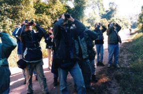 Domingo 22 de Julio de 2000 a las 9:45 Ya estabamos preparados para la primera salida, con los binoculares al cuello. Una miradita por el campamento indicaba que los demás integrantes listos para zarpar eran, sin lugar a dudas, verdaderos ornitófilos. Cada uno iba ataviado con su inseparable y particular parafernalia que lo acompaña desde hace años en sus salidas: gorro ornitológico, chaleco ornitológico, mochila ornitológica... Así, al oír la orden de partida de nuestro líder, comenzamos la marcha. Haríamos el corto trayecto hacia el estacionamiento, y de allí ascenderíamos por el camino hasta llegar al "Mirador", a unos 100 m más arriba. El zigzagueante camino de tierra atraviesa todo el parque en dirección general hacia el oeste, y constituye prácticamente la única vía razonable de desplazamiento, dado el escarpado relieve y la densa vegetación. Por suerte, la mayor parte de este inmenso Parque Nacional es prácticamente inaccesible, lo cual ayuda a preservar la fauna. El camino asciende por las húmedas laderas orientales de estas Sierras Subandinas, pasando por un puesto de Guardaparques en "Mesada de las Colmenas" (km. 13 a 1.150m) y abandona el Parque a gran altura, en un paraje conocido como "Monolito" o "Abra de Cañas" (km. 23 a 1.700m). Nuestra intención era llegar a recorrer la totalidad del camino en estos cuatro días, hasta la altura máxima. El objeto de la caminata era identificar aves. A lo largo del camino estaríamos atentos a reconocer las diversas especies que el azar y la suerte nos regalarían. Desde luego habría muchas aves que serían comunes, pero siempre había que estar atento a las variedades infrecuentes, porque sería posiblemente la única oportunidad que tendríamos para verlas. Debido a la enorme diversidad de especies, y siendo que algunas de ellas son muy parecidas entre sí, los especialistas no pasaban por alto un solo pajarito: cada ser alado era examinado minuciosamente, por las dudas se trate de una especie "rara". En algunos casos la identificación correcta requiere de gran conocimiento y agudeza visual, al haber especies muy parecidas entre sí. Entonces se recurría a comparar sutiles rasgos diferenciales. La posibilidad de aplicar en el campo tal refinado nivel de conocimiento le aportaba a los especialistas la mayor satisfacción. Y en algunos casos, cuando aparecía una duda, provocaban interesantes discusiones tendientes a consensuar los criterios. Para Nicolás y para mí, todo esto formaba parte de un deleitoso "curso al aire libre".