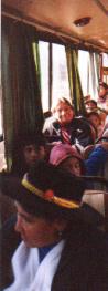 Martes 25 a las 8:00 Otra vez la misma rutina matinal. Vestirse dentro del tambor horizontal y salir por la puerta de carga frontal. Desayunar y volver a la carpa para buscar enseres. Las palas de nuestro imaginario lavarropas nuevamente se ponían a revolver prendas en busca de artículos vitales para la salida de hoy. Rollo de fotos, cantimplora, gorro. Estaríamos afuera por todo el día, así que teníamos que llevar el alimento en la mochila, y había que encontrar ese tenedor rebelde que se escabullía por el piso de la carpa. Finalmente todo estaba listo. ¿Otra vez a subir la cuesta hasta el Mirador? ¡NO! Esta vez había que recorrer la nada despreciable distancia de 13 kilómetros, siempre cuesta arriba, hasta el paraje denominado "Mesada de las Colmenas", subiendo desde los 550m hasta los 1.150m, es decir 600m de ascenso. En realidad había dos alternativas: subir a pié o subir en colectivo. No tuve dudas al tomar mi decisión. ¿Y los demás? Más allá de las valerosas proclamas que había oído en las recientes conversaciones del grupo, destacando los principios altivos del campamentista, casi todos se preparaban para enfilar secretamente hacia la parada del vehículo - salvo honrosas excepciones que aceptaron, y cumplieron, con el desafío de caminar. Y el vehículo llegó: un destartalado colectivo. Su interior delataba que, otrora, había conducido pasajeros por las calles de alguna ciudad pituca. ¿Barrios porteños, tal vez? ¡Cuántos habrán viajado a su trabajo en esto! Encima del parabrisas, cruzando de un extremo al otro, portaba aún aquel típico espejo de vidrio común, de silueta recortada artísticamente al estilo del filete, y biselado en todo su contorno. Marcado por diversas roturas mal cicatrizadas, ese espejo hablaba de épocas mejores. Hoy sería ciertamente reprobado por los códigos de seguridad. Pero lo más notable eran los ocupantes. Todos eran gente de la zona, de pieles cobrizas y curtidas, fisonomías características, y muchos luciendo vestimentas típicas, en particular las mujeres. Subimos en masa. En el más clásico estilo urbano, tuvimos