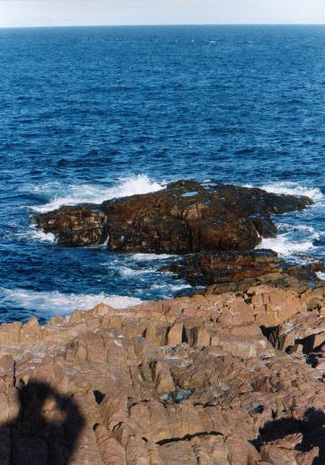Las rocas volcánicas de la formación "Chon Aike" se piedren en el mar en el Cabo Dos Bahías