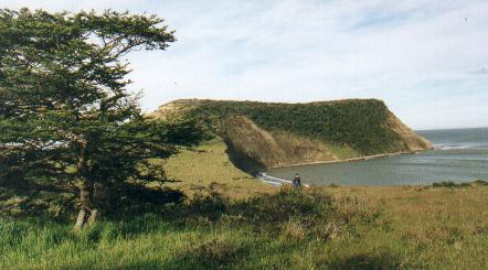 Este tramo fue tal vez uno de los pasajes de bosque más hermoso de todo el viaje. Al observar esta belleza multicolor que deleitaba la vista, traté de explicar objetivamente la razón por la cual uno confiere a esta visión ese justo calificativo: “belleza”. Llegué a la conclusión que, aparte del vívido colorido, tal atribución era consecuencia de la increíble complejidad y pureza de la imagen que llegaba a mis ojos tras surcar el aire fueguino cristalino. Infinidad de pequeñas hojas crenuladas en cada una de las miles de ramas que hubiera podido contar, infinidad de grietas en la corteza de cada tronco, infinidad de planos ocupados parcialmente por Barba de Viejo, dejando ventanas naturales que invitaban al juego de ocultamiento del plano siguiente. Y todos estos detalles llegaban juntos, nítidamente, y se asimilaban. ¡Que asombrosa es la capacidad de visión! Tal vez esa complejidad visual satura al intelecto, obligando a la mente a deponer para otro momento todo pensamiento, ansiedad y preocupación. Estaríamos embriagados visualmente, y por eso el paisaje era bello. ¿Será por eso que las edificaciones de El Alambra son hermosas, al quedar uno encandilado por los infinitos arabescos pintados en las mayólicas que adornan sus paredes, domos y columnas? Los caballos subieron la loma como si fuesen tractores, y buscaron acelerar el tranco para que su sufrimiento dure menos. De pronto la subida terminó, y también el bosque y la montaña: estábamos ahora frente al mar, en la cima de un acantilado. Sus paredes no eran verticales, sino inclinadas, exponiendo una gran ladera de arena y roca que bajaba a la costera. El paisaje era hermoso, pero aquí la sensación de belleza tenía otro origen: se debía a la serenidad de la imagen. La inmensidad del mar y del aire. Detrás, el fondo celeste del cielo, el horizonte y el Océano Atlántico, hoy calmo. Un paisaje infinito, armonioso y simple. El único accidente visual era el promontorio del Cabo Ladrillero, compuesto por una gran lomada que se internaba en el mar casi frente nuestro. Por su gran dimensión, y por nuestra ubicación particular respecto del mismo, nos daba una extraña perspectiva del cabo que no permitía comprender del todo su forma volumétrica.
