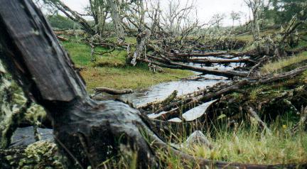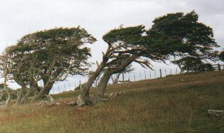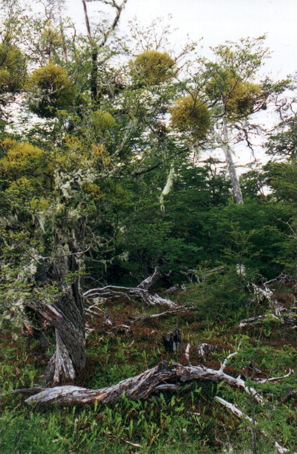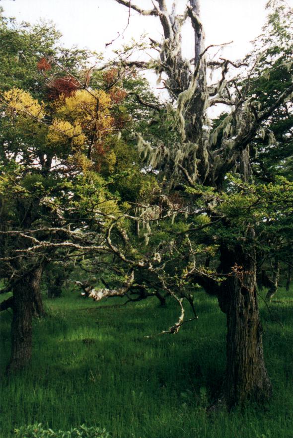 ----- o ----- El segundo día en la estancia lo pasamos subidos a caballo. Ante nuestra inquietud sobre la posibilidad de cabalgar, los patrones dispusieron 6 caballos verdaderamente hermosos equipados con comodísimos recados. Eran 6 por que nos acompañaría Mariana, hija menor de los terratenientes. Los cielos nos permitieron una salida de 6 horas. Iniciamos la cabalgata por el camino de tierra, rumbo a la costa. Pronto vimos, por primera vez, un grupo de Tordos Patagónicos. Seguidamente comenzamos el ascenso a una lomas elevada, circulando por una “calle” tallada en el bosque. A ambos lados veíamos los hermosos ñires, mostrando todos su característica forma, con troncos y ramas retorcidas. Avanzábamos entre arboles vivientes, de hojas pequeñas de verde bien oscuro, aunque uno siempre encuentra algunas dispares que han optado por mantener el color rojo vívido del otoño, el tono oxidado de la hoja seca invernal, o un amarillo brillante – vaya uno a saber de cual estación. El bosque no siempre era muy tupido, y en algunas partes diría que era bastante ralo, con arboles dispersos sobre una alfombra de pasto verde intenso. Todo en derredor de los arboles yacían innumerables troncos caídos y secos, algunos presentando desnudos su madera muerta, casi blanca, y otros recubiertos de abundantes líquenes, hongos y helechos. Pero todos ellos exponían formas aún más retorcidas, testimoniando la agonía y el dolor de la muerte. Sobre las ramas de los arboles vivos aparecían los llamados “Farolitos Chinos” (género Myzodendron). Estos vegetales parásitos de aspas radiales, cuyas inflorescencias terminales delimitan un espacio casi esférico de hasta un metro de diámetro, presentan colores brillantes y variados. Algunos pintaban de naranja o verde amarillento, y otros de rojo púrpura oscuro. Casi todas las ramas, incluso las muertas, estaban pobladas de curiosos líquenes de color gris verdoso, aptamente denominados “Barba de Viejo” por su aspecto de ramilletes de largos cabellos colgantes. Este último componente es el que daba espesor, multiplicando muchas veces el espacio ocupado por las delgadas ramas secas, y convirtiendo el paisaje en un verdadero entretejido corpóreo. Una maraña complejísima. ¿Pero que mejor que ver esto en dos imágenes de más alta resolución...?