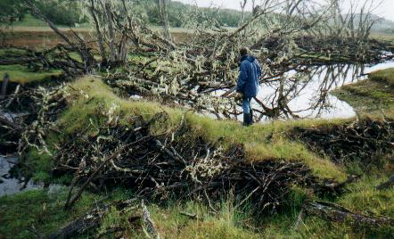 Según nos había contado Juan Apolinaire, los castores - traídos con fines peleteros hace más de 50 años - han invadido la isla, y ya han causado la pérdida de 1,6% del bosque fueguino. A diferencia de las especies arbóreas de su lugar de origen, los ñire crecen muy lentamente, dificultando la recuperación forestal. Además, al no tener enemigos naturales, los castores se multiplican y se han convertido, lamentablemente, en una plaga. Esa noche tuvimos oportunidad de contar a los dueños de casa sobre nuestra experiencia con los carpinteros, en un banquete algo formal que nos ofrecieron. ¡Cordero patagónico al horno! Delicioso... |