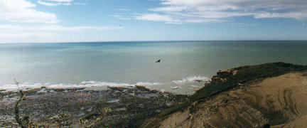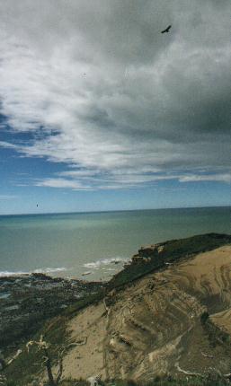 otra especie. A la tarde salimos en auto por el camino totalmente embarrado, hacia una loma alta desde donde es posible intentar una llamada telefónica por celular a la distante Río Grande. Teníamos que movilizar los tramites para que el semieje llegue desde Córdoba sin demoras. Luego fuimos a pasear a la costa. A pocos metros antes de llegar a la costa atlántica vimos el planeo de una gran sombra que sobrevolaba la zona, pasando por la vertical de costas pedregosas, bosques de ñire, e incluso las zonas bajas donde corre el Río Ladrillero. Era ni más ni menos que un Cóndor Andino. Eran 2 o 3. Nos detuvimos y los observamos planeando bastante bajos sobre nuestra posición. Aparentemente, hace 15 años no frecuentaban esta zona, pero ahora son comunes. ¿Será que no les queda hábitat más arriba en las montañas? ¿Será que no encuentran alimento? ¿A cuál de las múltiples consecuencias de alteración del ambiente estarán respondiendo? La costa en si era de puro canto rodado. Cientos de miles de piedras. Esta playa pedregosa se extendía por mucha distancia, pero hacia ambas direcciones había promontorios: hacia el sudeste el Cabo San Pablo propiamente dicho, y hacia el noroeste el Cabo Ladrillero.