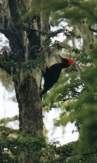 acercamos con extrema cautela y sin la más mínima prisa. ¡Y lo vimos! El inconfundible rojo puro de la cabeza y mitad del cuello del Carpintero Gigante macho, en el piso, picoteando un tronco desmembrado en busca de bichitos. Pronto advertimos que estábamos rodeados por toda una familia. Divisamos a la hembra, totalmente negra y con su ridículo pero distinguido "jopo" encorvado hacia delante. Y posado verticalmente en un árbol, el juvenil, que presentaba el mismo rojo vívido solamente en su modesto copete.