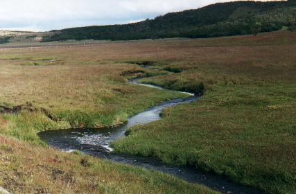 Hubo tiempo también para repasar la guía de aves, preparándonos a distinguir las especies que debíamos tratar de encontrar aquí. Estabamos rodeados por bosque de ñire (Nothofagus antarctica), y eso implicaba la posibilidad cierta de observar numerosos habitantes silvestres, propios de esta vegetación, algunas de las cuales nunca habíamos visto antes. Las ganas por descubrir pudieron más que el frío y la lluvia. La primera mañana salimos con Nico bajo la llovizna, con capas de agua y botas, a buscar los primeros ejemplares. Nos internamos por un bosque ralo detrás del casco y a poco andar encontramos a nuestro viejo y simpático amigo de otros bosques patagónicos: el Rayadito. Hubo abundantes Cabecitanegras Australes, una Remolinera Común - que más tarde pudimos observar desde las ventanas de la casita - y escuchamos el frecuente canto del Fiofío Silbón. Y con este último ejemplar quisiera extenderme. Al ver este pequeño pajarito de colores grises, es fácil identificarlo por su peinado estilo “raya al medio”, que expone un surco blanco brillante. Parece que se quiso engominar y lucir un peinado muy varonil del siglo pasado, pero el peine afilado que utilizó, al parecer, talló un profundo tajo en su cráneo. Se trata dada más que de plumas, pero el efecto es el de una herida ósea cauterizada, practicada por cirujano neurólogo. Otro aspecto notable de este pajarito es su canto. Más de una vez, al pasar por un bosque ralo, se oían sus llamados desde varias direcciones, indicando la presencia de 4 o 5 individuos. Esto no era sorprendente, siendo una especie muy común. Pero lo curioso era la variación de sus voces. Casi siempre anunciaba su presencia con una sola nota silbada: “…uíu…”. (Los puntos suspensivos al comienzo y al final intentan representar la modulación del volumen de la voz, que nace y termina muy suavemente, mientras que el énfasis central está dado por la “i”en mayúscula y acentuada). Pero esta nota se emitía afinada en tonos diferentes: más agudos o más graves, según el individuo. Cada personaje repetía su canto hasta el cansancio en su registro particular, enseñando insistentemente a los demás como se ha de cantar correctamente en DO, mientras que los demás se resistían a doblegar, aferrándose a sus muy propios SOL, LA y FA. Claramente esta especie no tiene oído absoluto. ¿O será que esta variación permite diferenciar familias, edades o estatus social? Otra variante del canto consistía en emitir 2 o más notas,