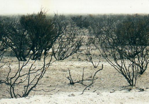 viendo ahora los resultados… Hacia el mediodía pasamos a visitar a un amigo de mi época escolar, el veterinario y eximio especialista en mamíferos marinos: Guillermo Harris, presidente de la Fundación Patagonia Natural. Además de su gentil hospitalidad y amena conversación, Guillermo explicó la posible causa del fenómeno aparentemente meteorológico que había creado una extraña bruma en toda la región: un incendio de monte. Tras despedirnos y retomar la eterna Ruta 3 hacia el norte, observamos la lenta pero sostenida intensificación de la nube de cenizas y humo. Casi 300 km. más al norte, al llegar a San Antonio Oeste, aún no habíamos alcanzado el epicentro. ¿Qué tamaño de fuego es éste, que afecta el aire de lugares tan distantes como Madryn? No cabía respuesta lógica en nuestras mentes. Pero pronto habríamos de comprender… Luego de tomar la Ruta 3 hacia el este, encontramos los campos quemados. Kilómetros y kilómetros y kilómetros de monte negro, consumido por las llamas. Este es el lugar donde había visto tantas aves cuando veníamos hacia el sur, donde había expresado el deseo de detenernos un momento a observar. Ahora, dos semanas después, no existía campo natural, sino campo quemado. Nos detuvimos, pero solo para sacar una lúgubre foto ¿Qué habrá hecho el fuego con los pichones, tortugas y otros seres que no tienen la movilidad necesaria para escapar su rápido avance? Seguramente se consumieron en las llamas, lo mismo que ocurrió con mi esperanza de recorrer estos montes a pie.