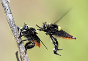 Bee-hunting Horse-Fly Mallophora ruficauda BRIEF MUSICAL VIDEO To the tune of a famous Nikolai Rimsky-Korsakov piece, this video shows two individuals of this species (male and female perhaps?), that are well known for terrorizing honey-bees. Duration: less than 1 minute |